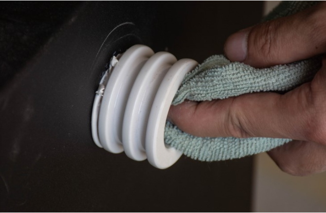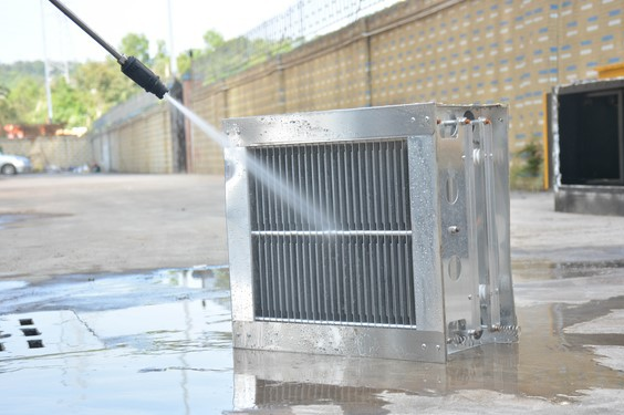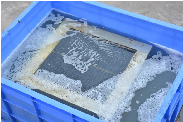 清洗油煙凈化器之前我們首先要準備以下防護工具; 清洗劑一斤,防護手套,高壓水槍,體積大于電場的水箱,以及護目鏡等小工具 第二步(打開設備柜門) 我們用鑰匙打開設備的電箱門,然后在打開設備的電場門(擰下左側的二顆螺絲) 第三步(設備放電) 當我們打開電場門之后,會看到二個鋁制的電場并排放置,這時我們先使用螺絲刀觸碰電場的高壓區和低壓區(四角都需觸碰)將殘留的電流釋放干凈 第四步(取出電場) 進行完放電工作后,我們將二個電場微微抬起后并用力抽拉出來即可(注意電場需要輕拿輕放,切勿將電場弄變形) 第五步(調制清洗劑) 我們將準備好的容器倒滿60度左右的溫水(清洗劑和水的比例1:25),將一斤清洗劑全部倒入并攪拌均勻。 第六步(清洗電場) 將取出來的電場平著放入容器中,浸泡5分鐘后我們將電場翻一個面繼續浸泡5分鐘(翻面的過程中在水中輕搖電場,晃動造成油污脫離)每個電場都是一樣的步驟 第七步(沖洗電場) 將浸泡完畢的電場取出來,用我們事先準備好的高壓水槍對電場的內部進行沖洗。如沒有高壓水槍也可以使用水龍頭管沖洗,一定要將電場內部的油污清洗干凈。(不可私自拆卸電場組件,不可用清潔球或鋼制物品清洗油污) 第八步(晾干電場) 將清洗干凈的電場放置于通風的地方,晾曬控干水分并檢查電場內部是否有異物或者是較大的變形。確保電場晾干后,無異物的情況下放回設備中。 第九步(清洗完步) 保證電場晾干后放回機箱,然后擦洗電箱陶瓷絕緣子直至清潔干凈為止,然后關閉機箱門即可